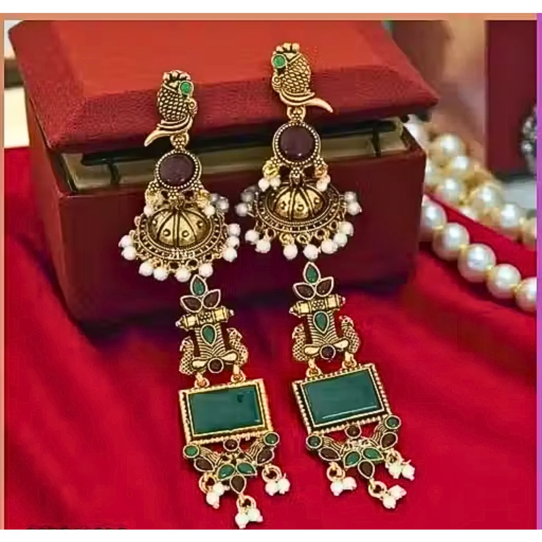 Name: Classic maroon peacock with multi green earring 2 pair #earrings #new #trending #jumkhas